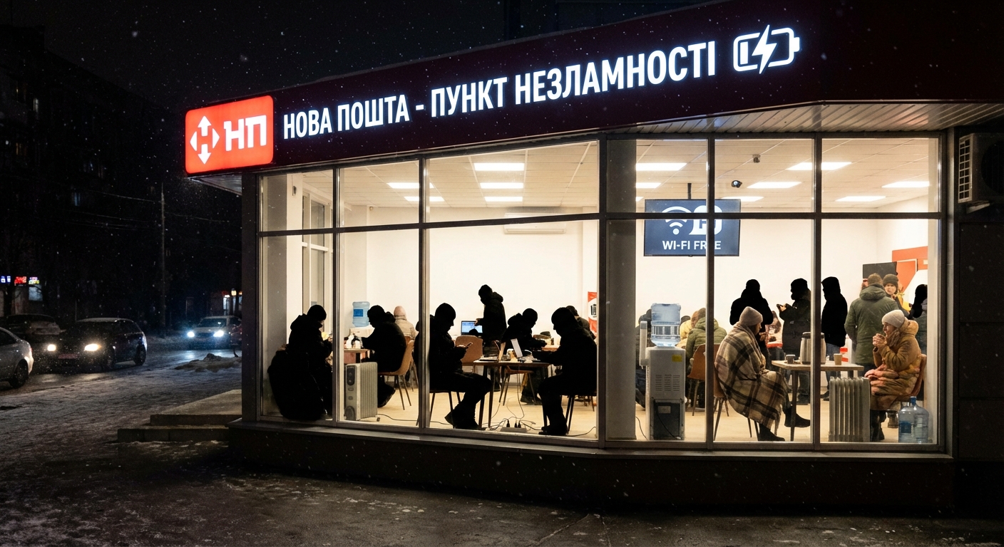 Одинадцять відділень Нової пошти в Києві працюють цілодобово як пункти незламності, попри критичний стан енергетики та важкі погодні умови. Відділення розташовані на правому та лівому берегах міста, забезпечуючи широкий спектр послуг, включаючи зарядку пристроїв, доступ до Wi-Fi та поштові послуги.