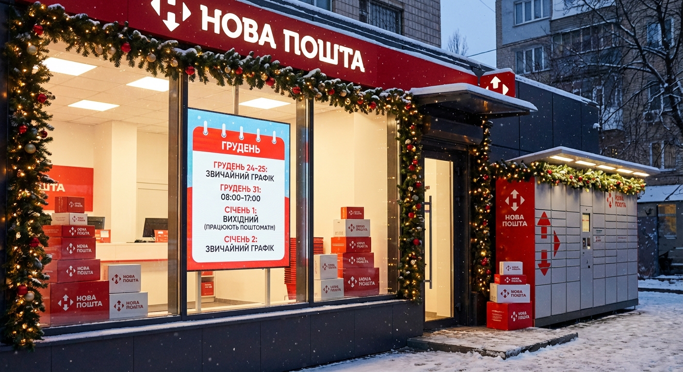 Нова пошта оголосила графік роботи на святковий період, зокрема 24 та 25 грудня відділення працюватимуть за звичайним графіком, 31 грудня — з 08:00 до 17:00, а 1 січня буде вихідним днем. Однак, послуги поштоматів залишаться доступними. З 2 січня робота відновлюється у звичному режимі.